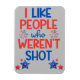 This 2024 Kamala Harris Election magnet is a fun spin off one of the many ridiculous things Donald Trump has said over the years. In an interview, when John McCain was called a "war hero," Mr. Trump said, "He was a hero because he was captured. I like people who weren't captured." So... "I like people who weren't shot," was born. This is funny and edgy magnet, yet still g-rated and appropriate for children and those with a low tolerance for bad language.