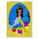 Kamaria is an enchanting and magical water creature known as a mermaid. Her black hair is decorated with a gold headband and starfish. She has a lovely purple bandeau top with golden starfish, lovely gold tail and fins, and a gold pearl belt. Kamaria the mermaid is petting her dolphin friend and holding a starfish as they play near the sandy golden ocean floor that is decorated with green seaweed plants, red corals, purple sea urchins that blow bubbles, and lovely seashells of white and brown stripes. You can get her on T-shirts, greeting cards, stickers, mugs, and postage stamps.
