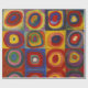 Wassily Kandinsky’s Colour Study – Squares with Concentric Circles (1913) is a pioneering work in abstract art, showcasing his innovative use of colour and form. In this painting, Kandinsky creates a series of concentric circles in various colours, arranged within squares. The work plays with the relationship between geometric shapes and the vibrancy of colour, with each circle and square radiating a unique energy. The use of bright, contrasting colours such as red, blue, yellow, and green generates a dynamic visual experience, inviting the viewer to explore the emotional resonance of each colour. Kandinsky’s composition emphasizes the emotional power of colour and its ability to transcend representation, making the work a significant step in the evolution of abstract art.
