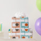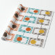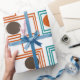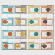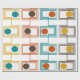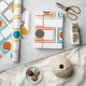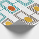 This wrapping paper has a Kandinsky inspired mid-century modern design of sets of rectangles formed by a continuous line each with an oval inside in retro colours of orange, brown, gold, and turquoise on a white background. If you like the design but prefer different colours, message me.