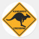 Traditional kangaroo crossing road sign as seen in the Australian outback. Yellow and black diamond-shaped warning sign.