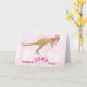 This is a fun Valentine's Day card featuring an illustration of a happy kangaroo jumping. The kangaroo is wearing pink heart shaped glasses and a pink, with lighter pink hearts and white dots, bandanna. Underneath the kangaroo is the text: 'YOU MAKE ME JUMP FOR JOY'. The word 'JUMP', surrounded by stars, is in larger letters and is curved and higher than the rest of the text and there is a small pink heart between each of the letters. The background is pale pink with pink tree silhouettes.