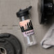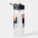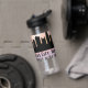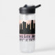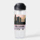 Stylish water bottle features skyline silhouette of Kansas City, MO with map coordinates on a watercolor splash background,