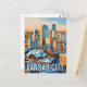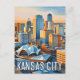 A vintage-style travel poster featuring the iconic Kansas City skyline. The image showcases the city's distinctive skyline ,The poster is designed in a retro style with a vibrant colour palette and a nostalgic feel.