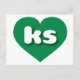 This postcard features a vibrant green heart containing the bold, white, rounded lower case letters ks, a playful abbreviation for Kansas, the sunflower state. The reverse side of the postcard is blank, awaiting your personalised text or handwritten sentiments.