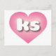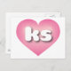 This postcard features a pink heart with a white-washed centre containing the bold, white, rounded lower case letters ks, a playful abbreviation for Kansas, the sunflower state. The reverse side of the postcard is blank, awaiting your customised text or handwritten sentiments.