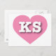 This postcard features a vibrant pink heart containing the bold, white, upper case letters KS, the official abbreviation for Kansas, the sunflower state. The reverse side of the postcard is blank, awaiting your handwritten sentiments or customised text.