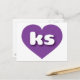 This postcard features a shapely and vibrant purple heart containing the bold, white, rounded lower case letters ks, a playful abbreviation for Kansas, the sunflower state. The reverse side of the postcard is blank, awaiting your handwritten sentiments or customised text.