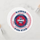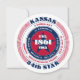 A bold, patriotic design featuring red, white, and blue evokes feelings of freedom, loyalty, and unity. The state name, "Kansas," is prominently displayed, surrounded by information about the capital, residents, region, time zone, and geographic coordinates. The backside is blank - leave it as is or add your text by accessing the design tool. Perfect for national holidays and patriotic events.