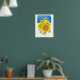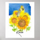 A poster decorated with a western meadowlark bird in a field of bright blooming sunflowers in summer over the state shape in royal blue drawn with pen and ink and painted with watercolor. Inspired by the state bird and state flower of Kansas. Great for college dorm room decor or anyone who loves "The Sunflower State!"