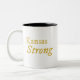 Prominently displayed on the front of the mug is the bold, stylish typography spelling out "Kansas Strong" in striking golden letters. The use of gold accents adds a touch of luxury and prestige, elevating the mug's visual appeal and making a powerful statement. The choice of font reflects modern design sensibilities, with sleek sans-serif characters that convey a sense of strength and resilience.