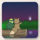 This coaster features a drawing of a kappa and a kitsune from behind, looking at a hitodama floating over a pond at dusk. This coaster is great for a fan of Japanese yokai, but the characters can also pass as just a turtle and fox, for those who aren't familiar with these mythological creatures.