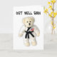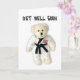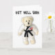 Photo of a furry bear in a Karate uniform, complete with an American flag patch, expresses a wish to Get Well Soon.