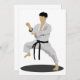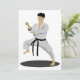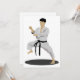 Strike an awesome karate pose just like this one. This person is in there karate outfit and they are in a karate pose. This karate person is wearing a black belt. This karate pose design looks great on these invitations