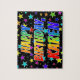 This lively, fun, birthday-themed jigsaw puzzle design features the message "HAPPY BIRTHDAY, KAREN" with the characters having a colourful rainbow spectrum inspired gradient pattern, along with a vibrant stars background pattern. An exciting puzzle like this might be a fun way to acknowledge the birthday of somebody named Karen. [~Z0000468]