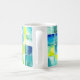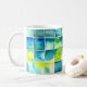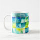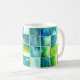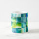 Eine karierte Aquarellzeichnung in frischen Blau-Grün-Tönen sorgt für eine fröhliche Morgenstimmung.