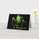 This birthday card features a lively green katydid on a pure black background. More katydids are inside. They are medium-sized to large insects. They are usually green, sometimes with brown markings, and are camouflaged to blend with the leaves they feed on. Their very long antennae distinguish them from grasshoppers. Seen up close, they seem to be aliens from outer space! All text can be customised to suit your special occasion.