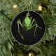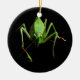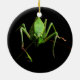 This holiday ornament features a lively green katydid. Katydids are medium-sized to large insects. They are usually green, sometimes with brown markings, and are camouflaged to blend with the leaves they feed on. Their very long antennae distinguish them from grasshoppers. Seen up close, they seem to be aliens from outer space! This is sure to promote conversations hanging from your Christmas tree or anywhere in the house.