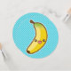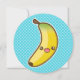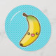 Cute yellow cartoon banana fruit character with a happy face expression. The background colour is blue with a light polka dots pattern.