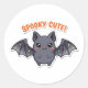 Adorable kawaii bat sticker with sparkling stars, perfect for Halloween decorations, laptops, and scrapbooking. Cute vampire chibi design with text “Spooky Cute!”.