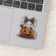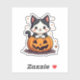 Adorable kawaii black and white kitten in chibi style with Halloween pumpkins and spooky tones. Perfect for seasonal stickers and gifts.