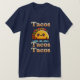 Funny shirt with a cute Kawaii cartoon taco dancing. Vintage text says, tacos, tacos, tacos.