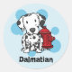 Cute Dalmatian stickers for spotted dog lovers! A kawaii cartoon of the dog breed sits by a red fire hydrant. Perfect to represent this popular firehouse dog! Adorable drawing with a background of blue spots. Available on a wide range of merchandise.