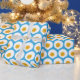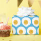 A repeat pattern of happy fried eggs sunny side up on a blue background.