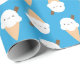 A repeat pattern of classic British '99' vanilla ice cream cones with chocolate flake, kawaii style, on a bright blue background. The perfect sweet summer treat.
