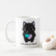 Express your deepest affection for both felines and caffeine with this adorable "COFFEE IS MY LOVE LANGUAGE" Mug! The design features a chunky, cute, kawaii-style black cat with a little purple heart on its chest, happily holding a bright blue coffee mug.