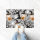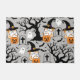 An adorable kawaii kitty dressed as a witch, holding an orange pumpkin, as she goes trick or treating in a spooky graveyard surrounded by ghosts and bats.