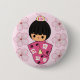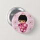 A cute button featuring a kokeshi doll in a pink kimono with a cute yellow hat on a cherry blossom background. A fun combination of Japanese traditional art and flirty kawaii style.