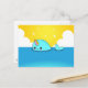 A sweet little blue kawaii narwhal swimming with a beautiful yellow sky behind him.