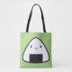 A cute happy Japanese onigiri rice ball with nori seaweed wrapping.