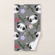 Smiling panda faces, flowers, and bamboo in a kawaii style with a grey background
