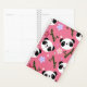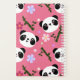 Smiling panda faces, flowers, and bamboo in a kawaii style with a pink background