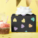 Repeat pattern of candy hearts in pastel rainbow colours with happy kawaii faces on a black background