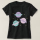 Cute planets with kawaii faces and tiny stars in space. Pastel colours on a dark blue background.