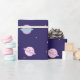 Repeat pattern of cute planets with kawaii faces and tiny stars in space. Pastel colours on a dark blue background.