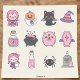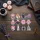 You'll find delightful characters like a sweet vampire girl, a whimsical pumpkin ghost, a friendly black bat-cat, and a fluffy pink three-eyed monster. The pack also includes mystical elements such as a witch hat, bubbling cauldron, glowing potion bottles, a spooky coffin, a little spider, and even a cute RIP tombstone with a ghost. These high-quality vinyl decals are perfect for personalising laptops, water bottles, planners, or adding a unique touch to your pink Halloween crafts and decor.