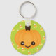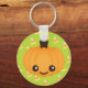 Cute Halloween pumpkin with a cute smile on its face, with candy corn in the background.