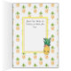 Custom and personalise this design. What a super unique and fun design. The front of this card has an old, distressed wood grain effect. It looks like an old wooden barn or farmhouse cottage that's worn and primitive. You'll see the words " party like a " at the top front, and the words " pineapple " below it. The word pineapple is in this fun, geometric font. Under the text are swags of party bunting banner flags that are in a bright blue and yellow. They are nicely designed to take your eye from the text, down the card to a sassy chic kawaii pineapple. The cartoon like pineapple fruit looks like she is in watercolors and is so girly and sweet, with watercolor flowers on top of her "head" in shades of pink and blue. She also has blue green eye glasses, eyelashes and blush on her cheeks. She is ready for a summer BBQ pool party, or a beach party, don't you think? On the inside of the card, is a pop of yellow everywhere, lol. The pattern you'll see on the inside, is a watercolor pineapple. It is the perfect background for this wonderful card. You'll also see another watercolor pineapple here, this one looks the same, only she has a light pink bow in her hair, and retro vintage style bright yellow glasses. She is brightly coloured golden yellow with bright green and yellow green leaves. On the right inside of the card, two pale pastel yellow borders and inside is where you can type in whatever you would like. Another summer party pineapple is sitting below. This one is more on the pastel lighter colours.
