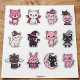You'll discover whimsical characters like a sweet pink fox-cat, a cute vampire kitty, a mischievous devil cat, and a black cat perched on a pumpkin lantern. Plus, find enchanting variations including a white witch cat, a black witch cat, a pretty pink cat, another cute black cat in a witch costume, a winged black cat with a pumpkin, a vampire bunny-cat, a black cat on a crescent moon, and a stitched button-eyed pink cat. These high-quality vinyl decals are perfect for personalising laptops, water bottles, planners, journals, or adding a unique touch to your pastel goth crafts and decor.