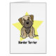 Adorable Border Terrier cartoon drawn in Japanese kawaii. The dog breed sits with his head tilted in front of an enormous yellow star, with the breed name printed underneath. Unique and super cute Border Terrier gifts for pet lovers.