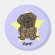 Adorable Mastiff cartoon drawn in Japanese kawaii. The brindle dog breed sits with his head tilted in front of an enormous yellow star, with the breed name printed underneath. Unique and super cute English Mastiff gifts for pet lovers.