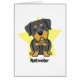 Buy a cute Rottweiler card, drawn in a Japanese cartoon style known as kawaii. The working dog breed is sitting in the middle of a large yellow star, with the breed name printed underneath. On a large assortment of Rottie merchandise for dog lovers.