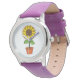 The watch looks exactly as depicted. I was especially pleased with the watch band, which is a nice quality, supple leather. I point this out because an option, which was sold out, was with a multi-colored but clearly plastic band. This is the better choice, in my view.