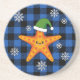 Kawaii Xmas Starfish on Blue Buffalo Pattern Coaster