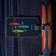Three bright stylised kayaks on a navy blue background - a great water-sport luggage tag for the kayak enthusiast or kayaking clubs. Fully customisable.