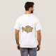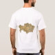 An editable title and slogan accompanies the yellow motifs on a blue background of the Kazakhstani flag on the front of this t-shirt. The back displays a detailed map of Kazakhstan.